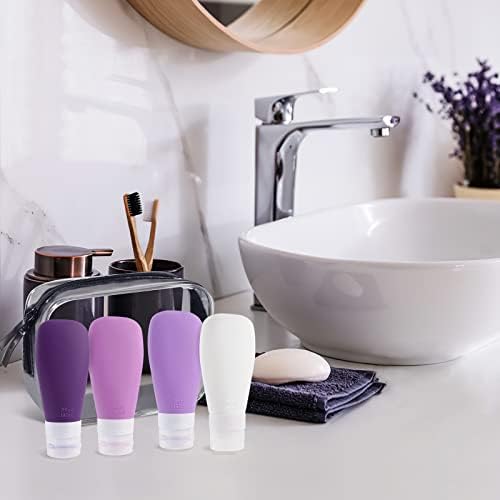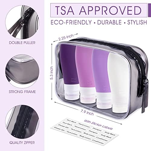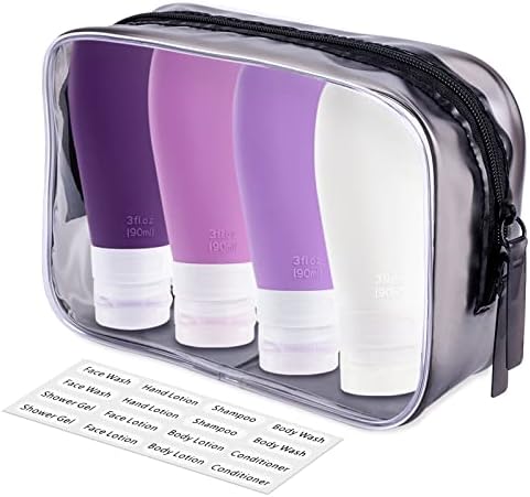 TSA Carry on Approved: 4 pack 3 ounce silicone travel bottles, perfect for shampoo, conditioner, body wash, lotion, hand sanitizer, shower gel. Packed with a high quality zippered clear toiletry bag, saving space, easy to carry with for travels or gym workout.
